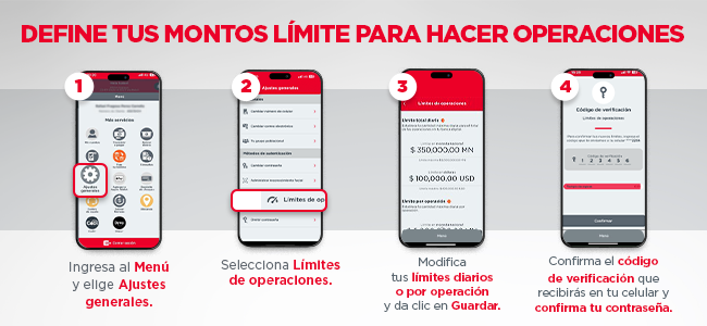 Por seguridad y para tener el control, puedes definir tus límites diarios y por operación con un monto bajo o el monto con el que estás acostumbrado a operar tu banca digital.