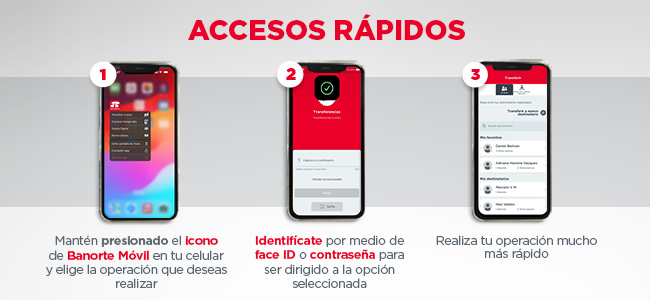 En Banorte Móvil tienes una nueva manera de agilizar tus operaciones, mantén presionado el icono de la app y usa los accesos rápidos para ahorrar tiempo y simplificar tu día. Realiza operaciones como: