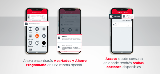 Mejoramos la experiencia en Apartados y Ahorro Programado, para que ahora sea más fácil navegar en entre estas opciones, además de otras mejoras.