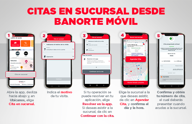 Solo ingresa a Banorte Móvil, en la sección Ubícanos elige Cita en sucursal y sigue estos pasos: