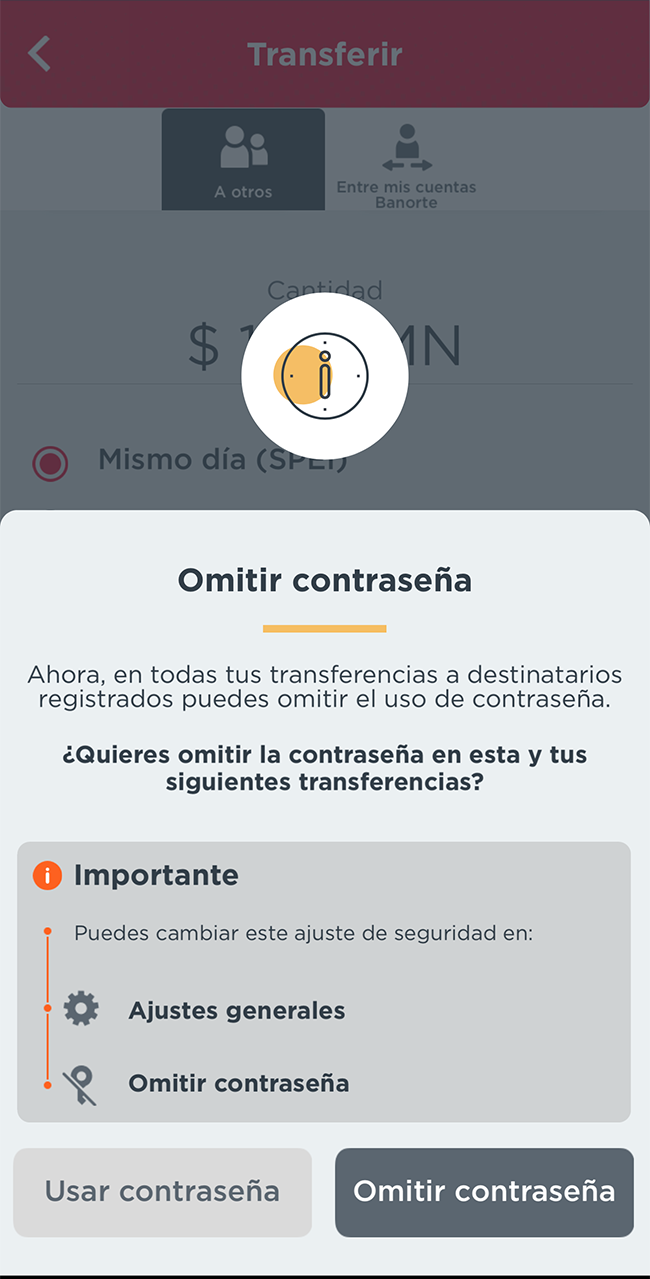 Ahora con Banorte Móvil, al realizar tus transferencias a destinatarios registrados, puedes omitir el uso de tu contraseña. También puedes cambiar la configuración cuando lo desees desde ajustes generales, omitir contraseñas.