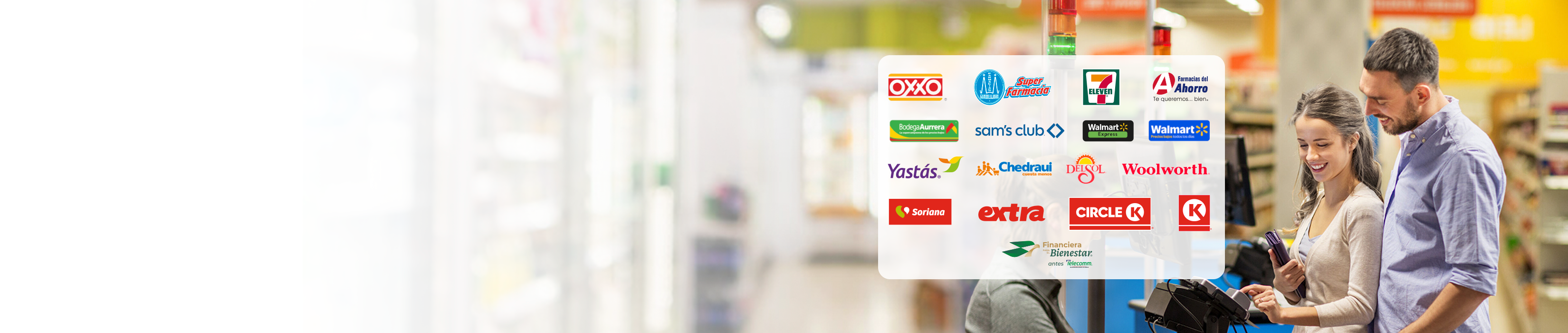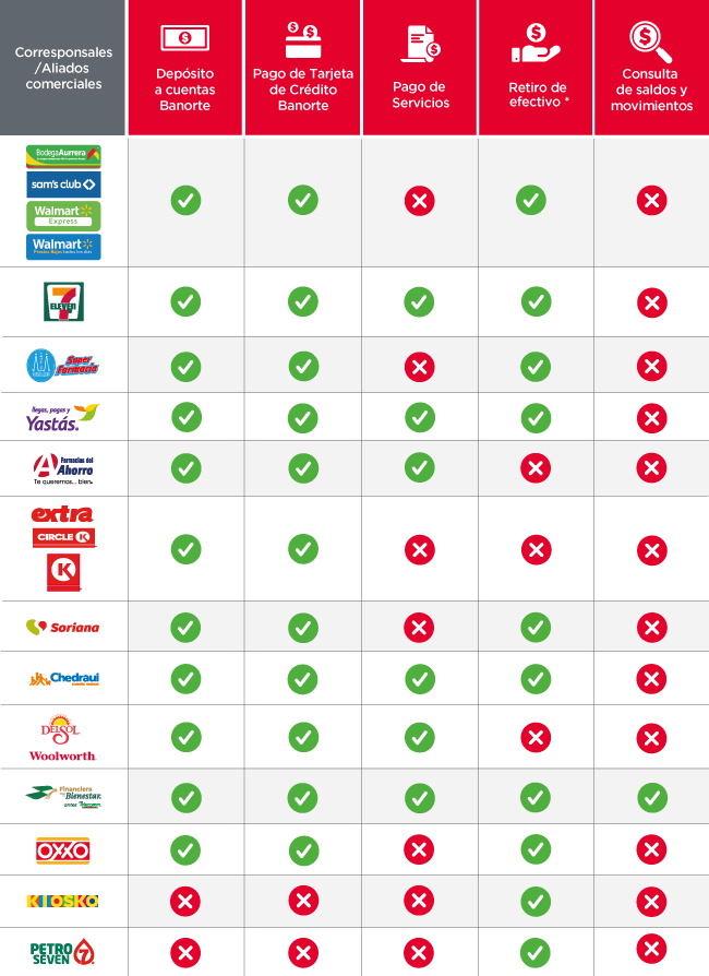 Retira efectivo con tu Tarjeta de Débito Banorte en tiendas Yastás, OXXO, 7-Eleven, Soriana, Chedraui, KIOSKO, Walmart, Bodega Aurrera, Bodega Aurrera Express, Mi Bodega Aurrera, SAM’s Club y Walmart Express.