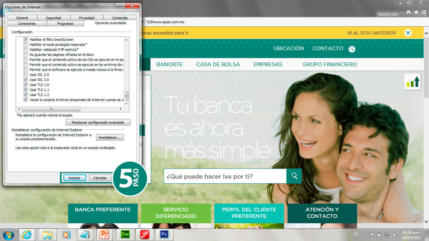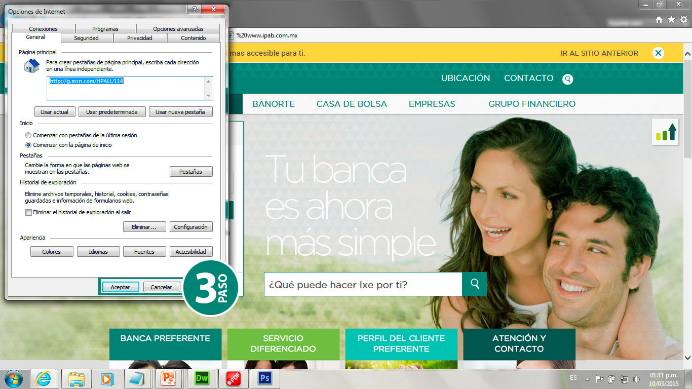 Ve a Opciones de internet, dar clic y se abrirá una ventana adicional.