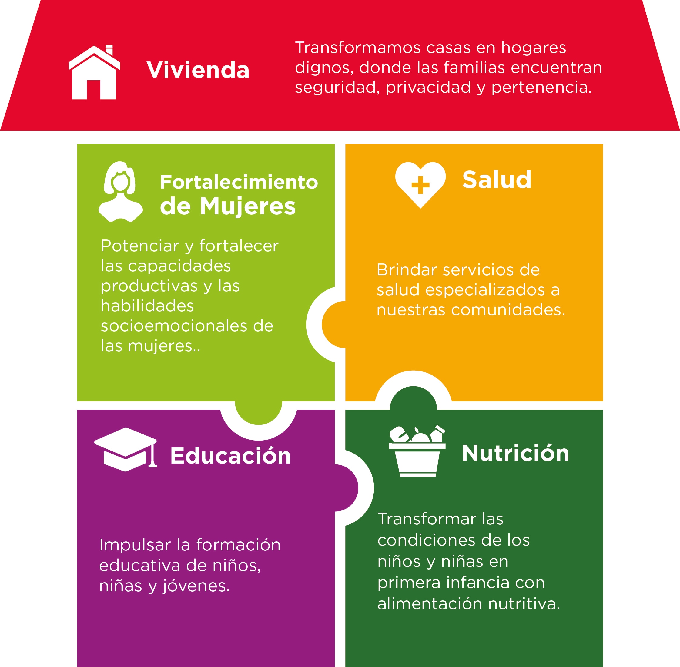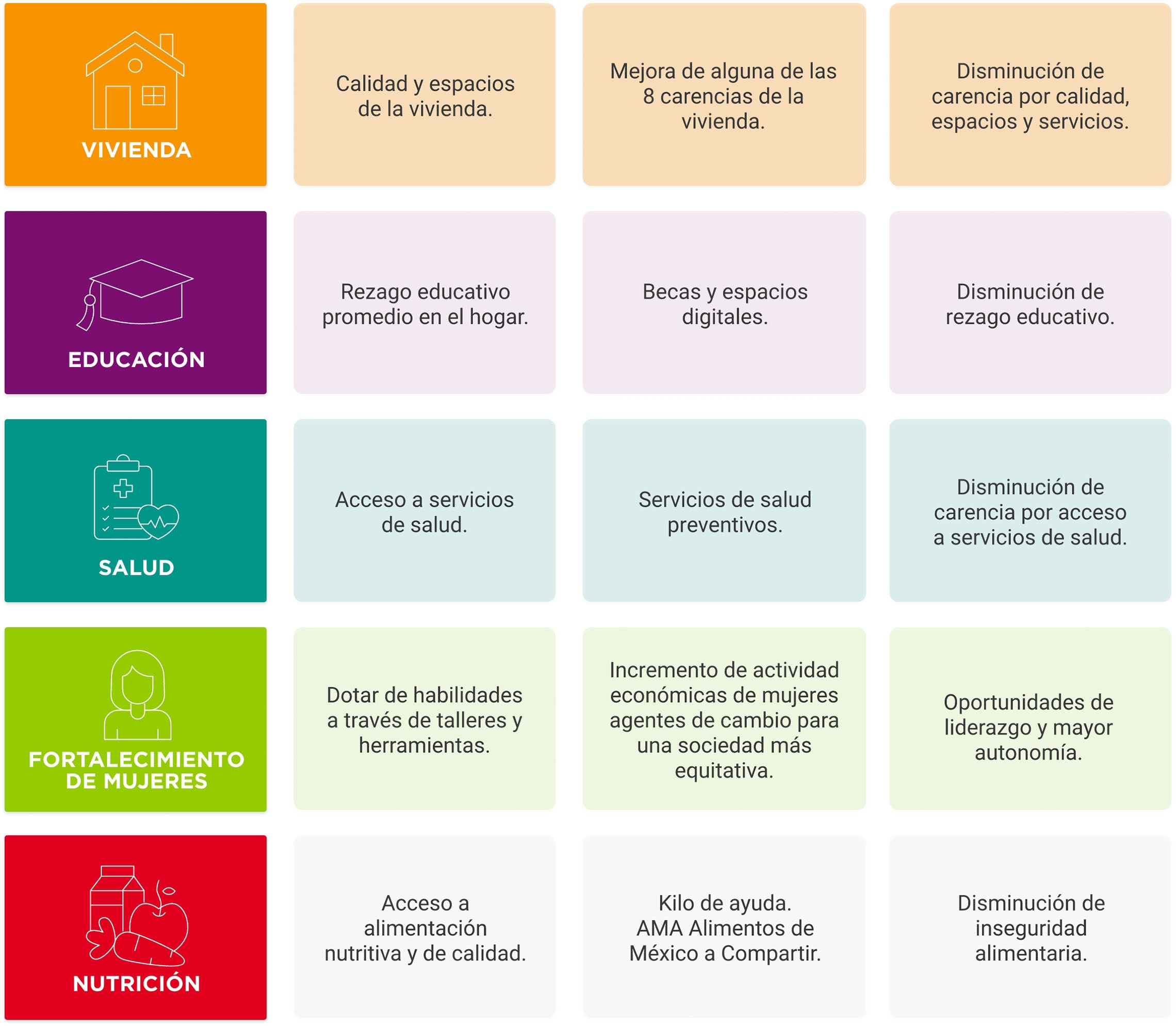 A través del Programa Integral, se brinda apoyo en cinco ejes: Vivienda, Salud, Educación, Empoderamiento de las mujeres y Nutrición a población en situación de vulnerabilidad. Así, se mejora la calidad de vida de las familias mexicanas y se contribuye a la inclusión social impactando en los Objetivos de Desarrollo Sostenible (ODS) en cada uno de sus ejes de acción: