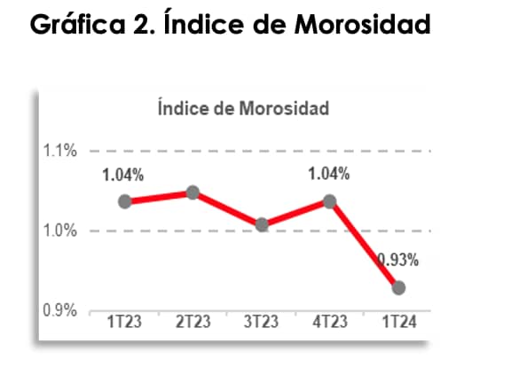 El índice de morosidad (antes índice de cartera vencida) se ubicó en 0.93%, un nivel históricamente bajo que ubica al banco como uno de los más sanos del sistema.