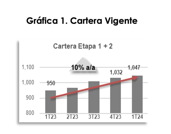 - Durante el primer trimestre de 2024, la cartera de crédito vigente se consolida en el billón de pesos, expandiéndose 10% en su comparación anual.