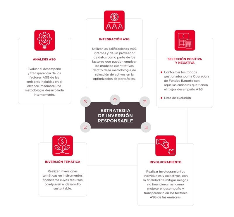 Con el objetivo de mantener nuestro compromiso de seguir promoviendo e implementando las mejores prácticas en los procesos de inversión, con una visión de sostenibilidad y responsabilidad, hemos implementado diversas estrategias de inversión responsable: el análisis ASG, la integración ASG, la selección positiva y negativa, y la inversión temática las cuales se complementan con la estrategia de propiedad activa.