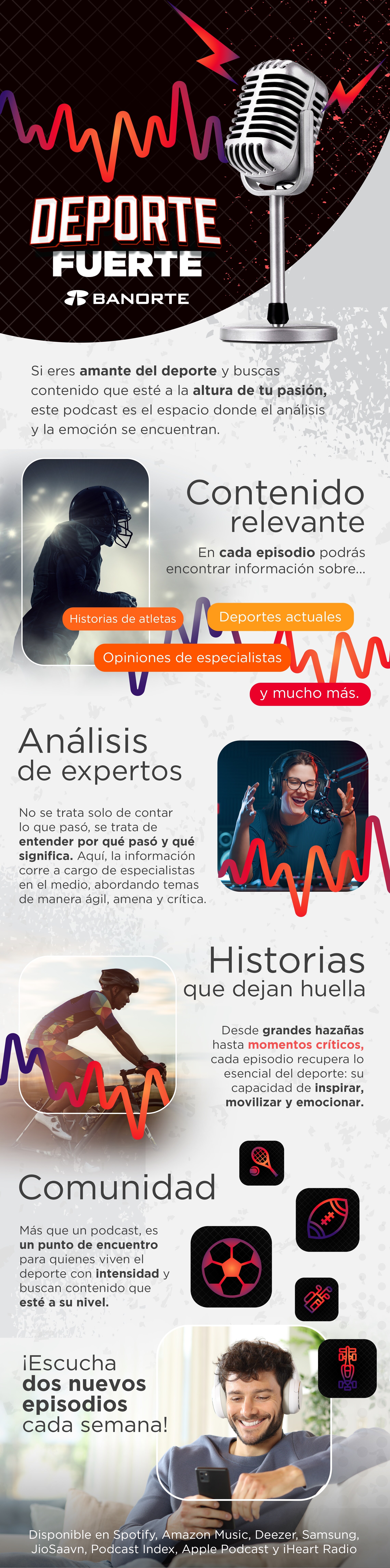 Si eres amante del deporte, conoce Deporte Fuerte Banorte, un espacio para llevar tu pasión al siguiente nivel, con historias únicas, análisis e información con la voz de expertos. ¡Conócelo!