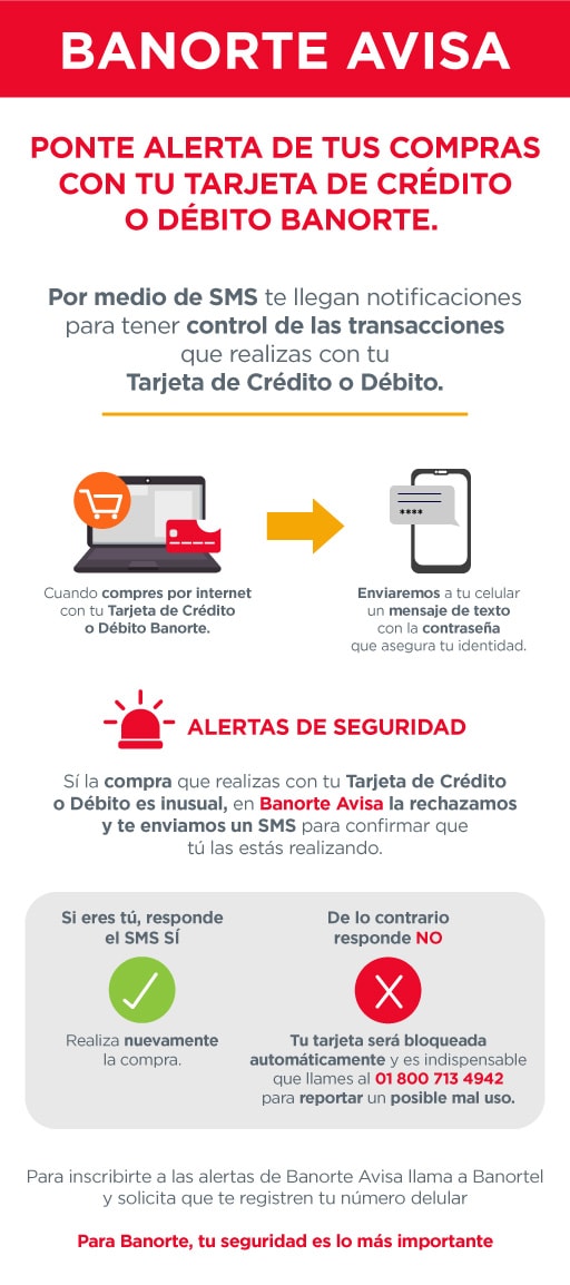 Conoce las facilidades que te brinda Banorte Avisa; una de ellas es notificarte sobre las compras que se realizan con tus tarjetas.