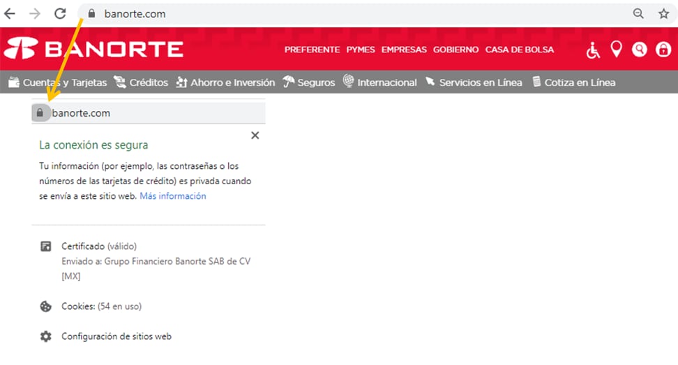 Otra manera de saber si estás en un sitio seguro es revisando si el navegador tiene el símbolo de un candado. Al dar clic en este, te indicará el tipo de certificado de seguridad que tiene la página.