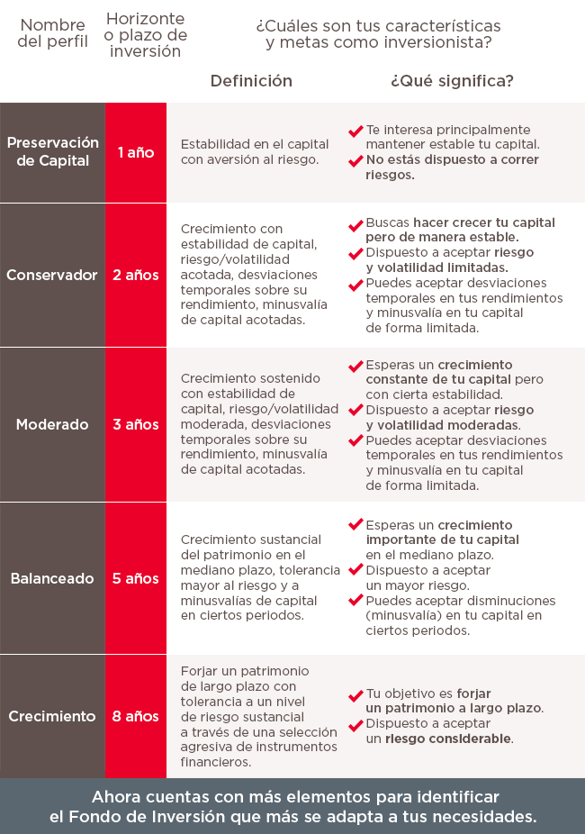 Es muy importante tener claro tu “perfil”, es decir, tus necesidades e intereses como inversionista. Algunos datos importantes son: el tiempo que deseas mantener tu dinero invertido y la meta que deseas alcanzar.